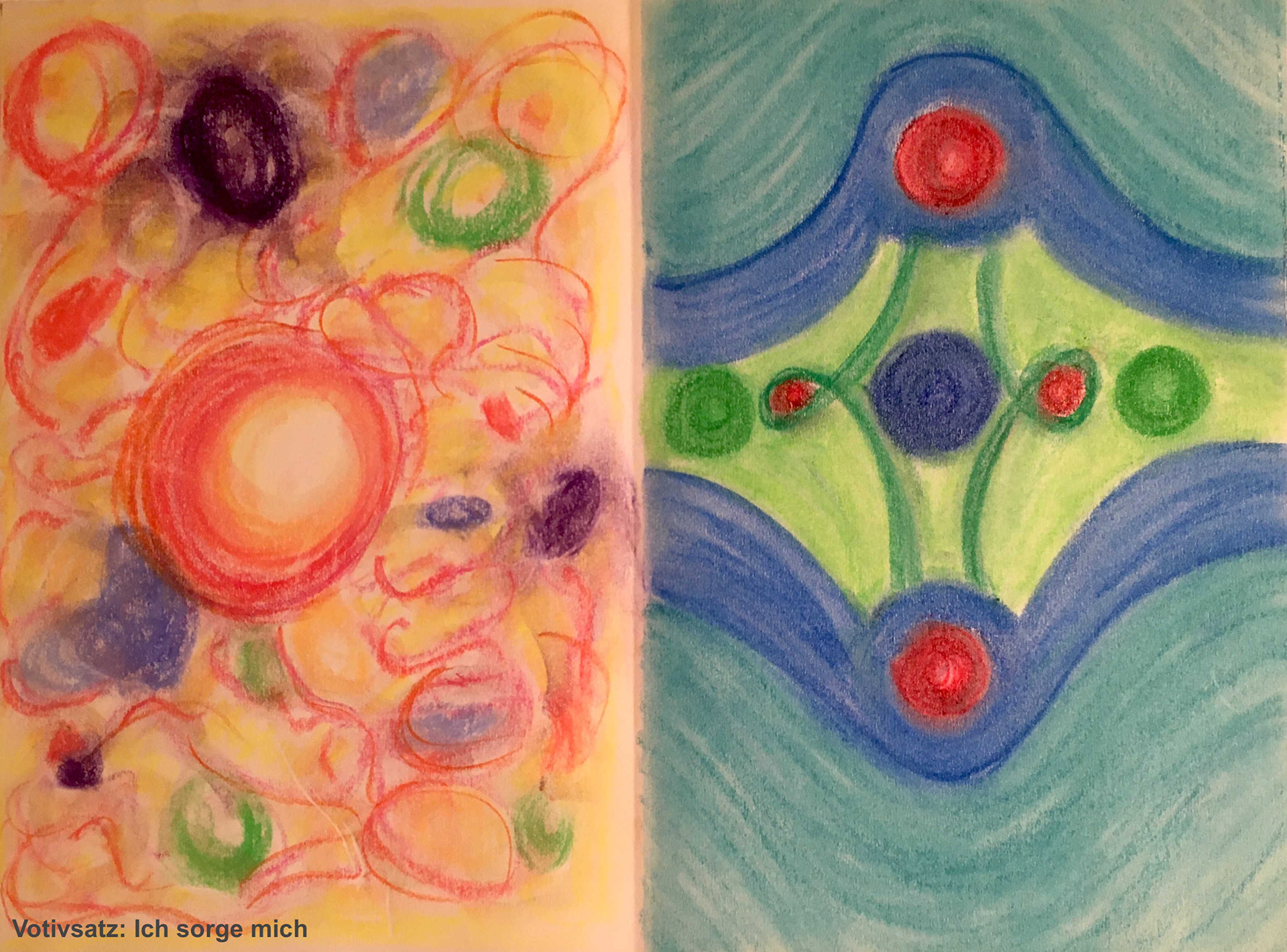 Das linke Bild mit dem Thema "Ich sorge mich" wirkt ungeordnet auf mich. Die große, runde Mitte fällt auf, die umgeben ist von einer zarten orangenen Linie, die aber nicht die komplette Kreismitte umschließt. Gehalten ist die rote Mitte von einem hellen Gelb, welches mich hineinzieht in die Tiefe. Das Bild strahlt wenig Ruhe auf mich aus. Ich spüre ein kunterbuntes Weben ringsum, das nach Ordnung sucht und zur Orientierung aufruft.